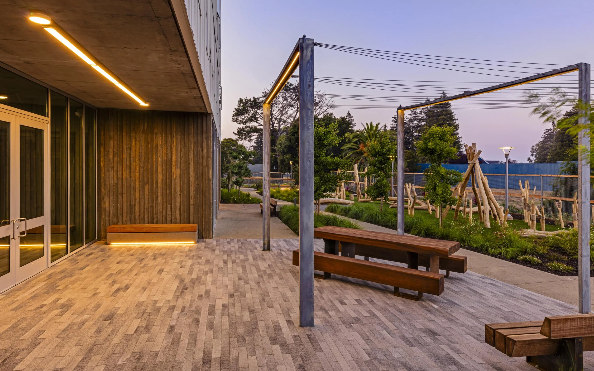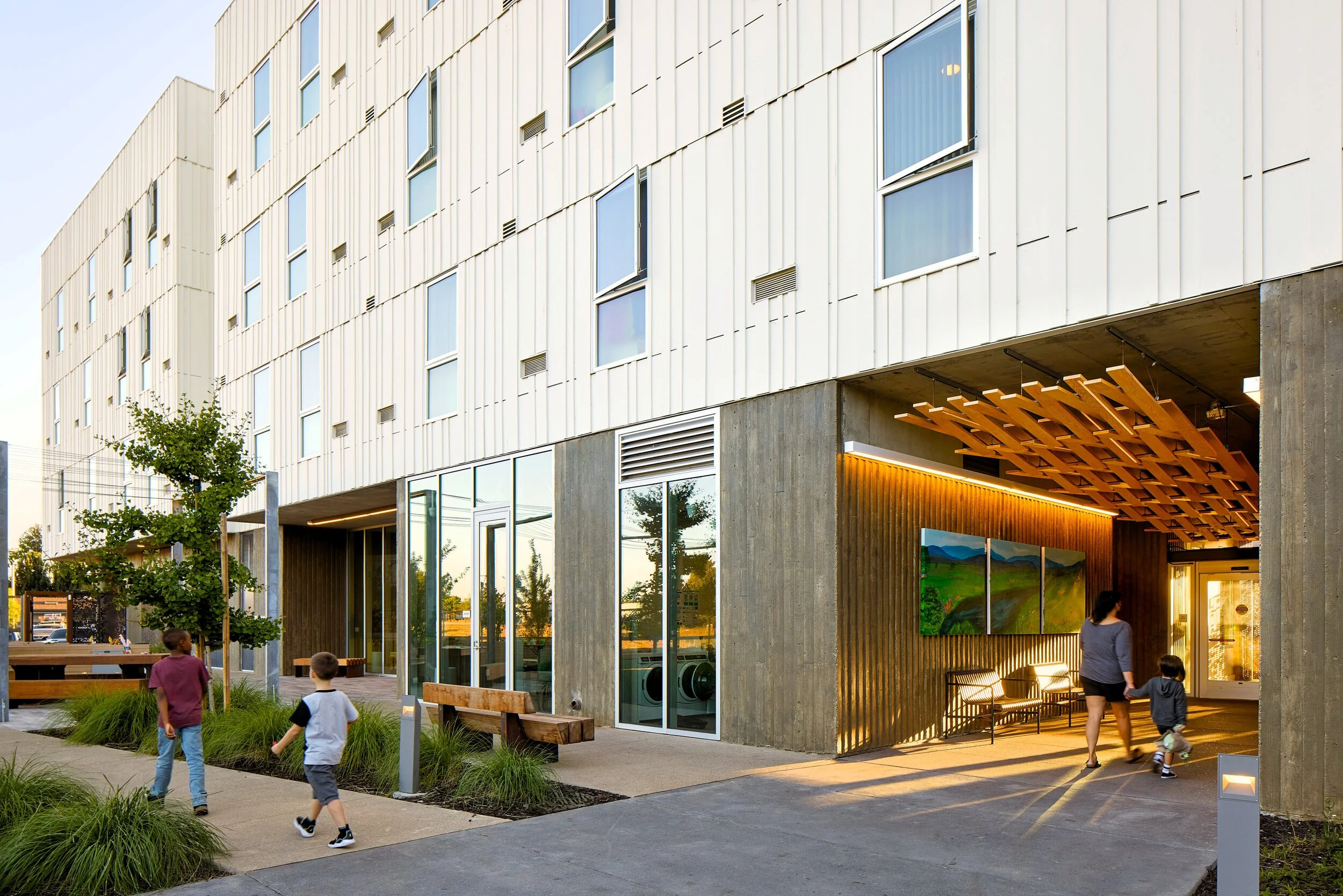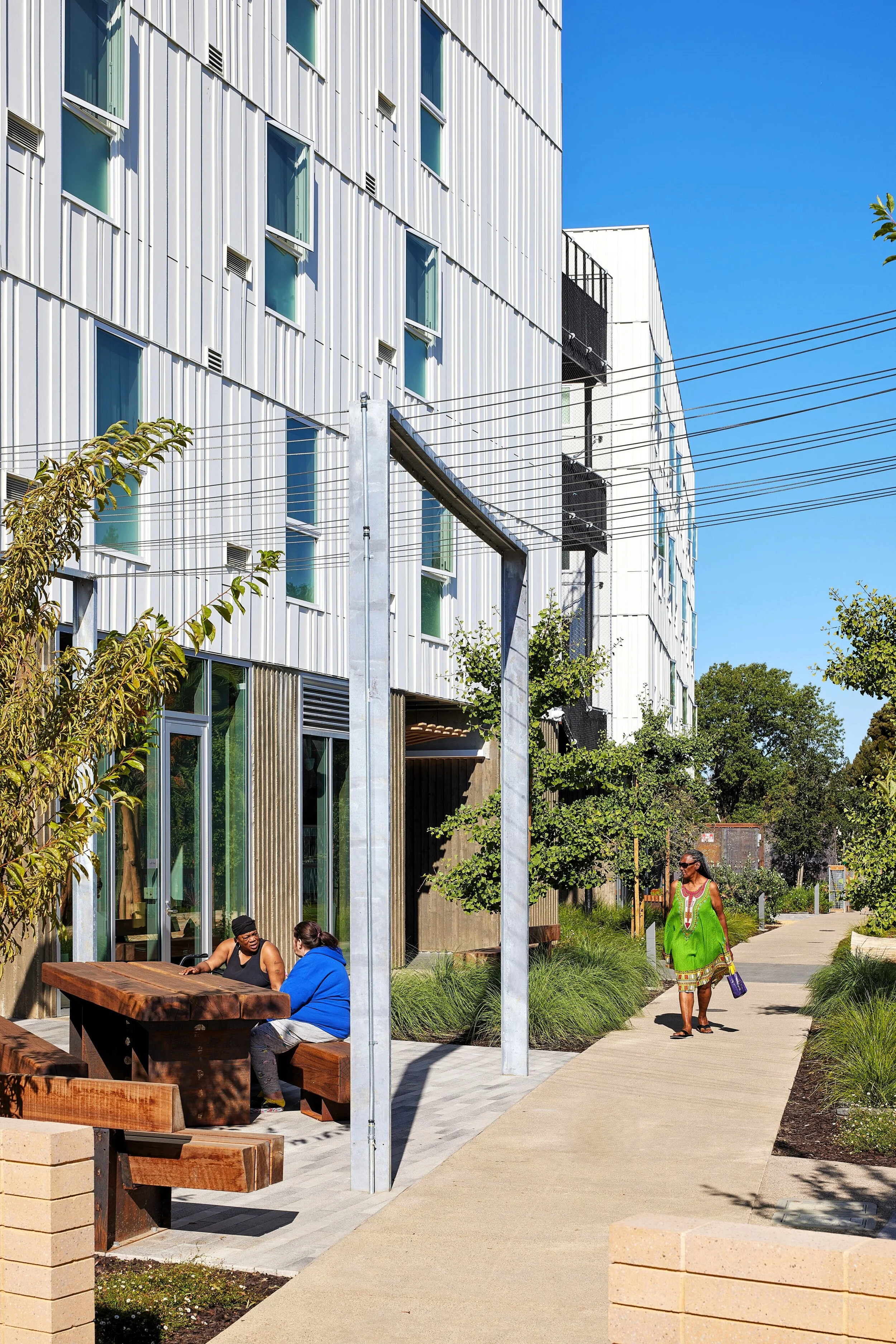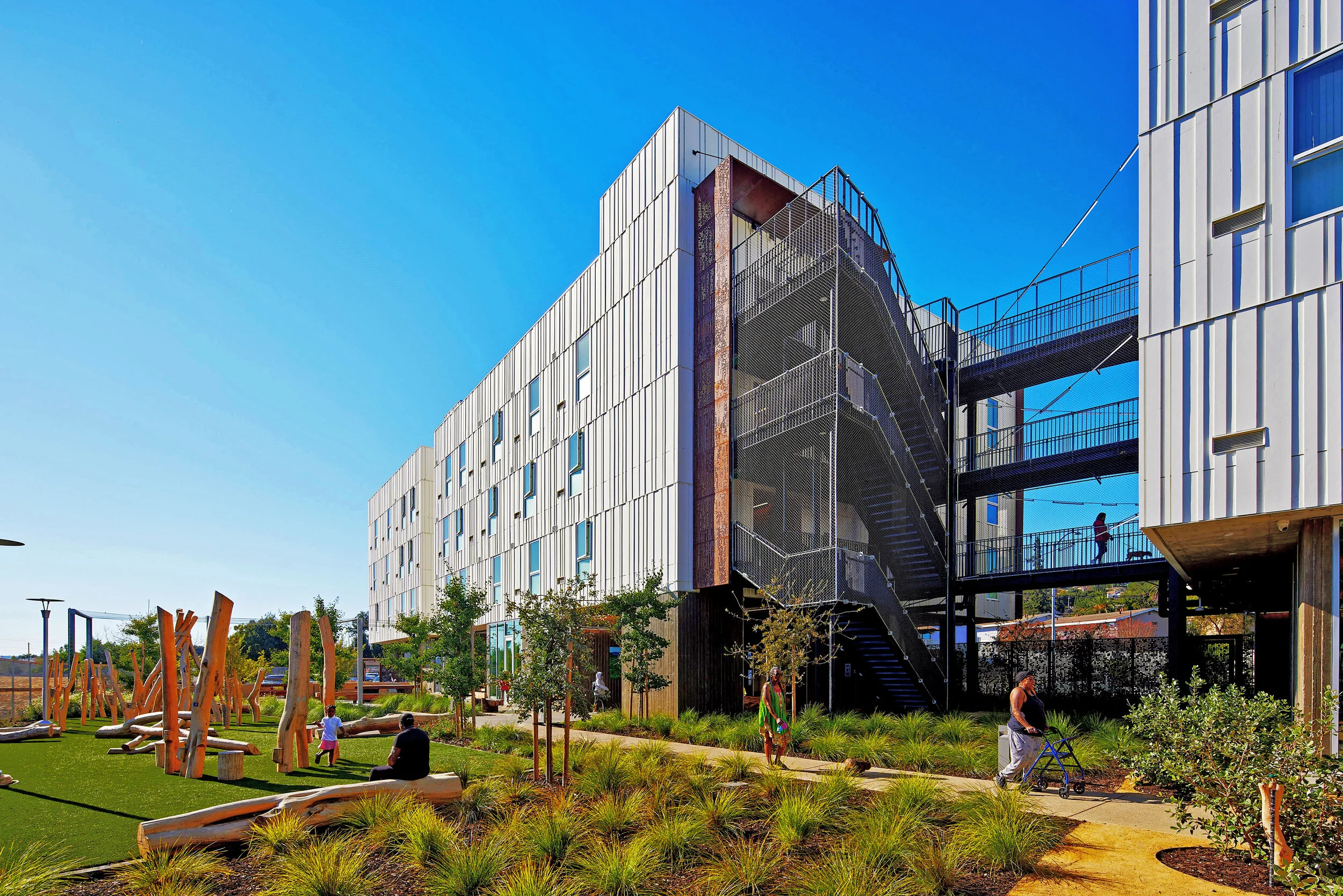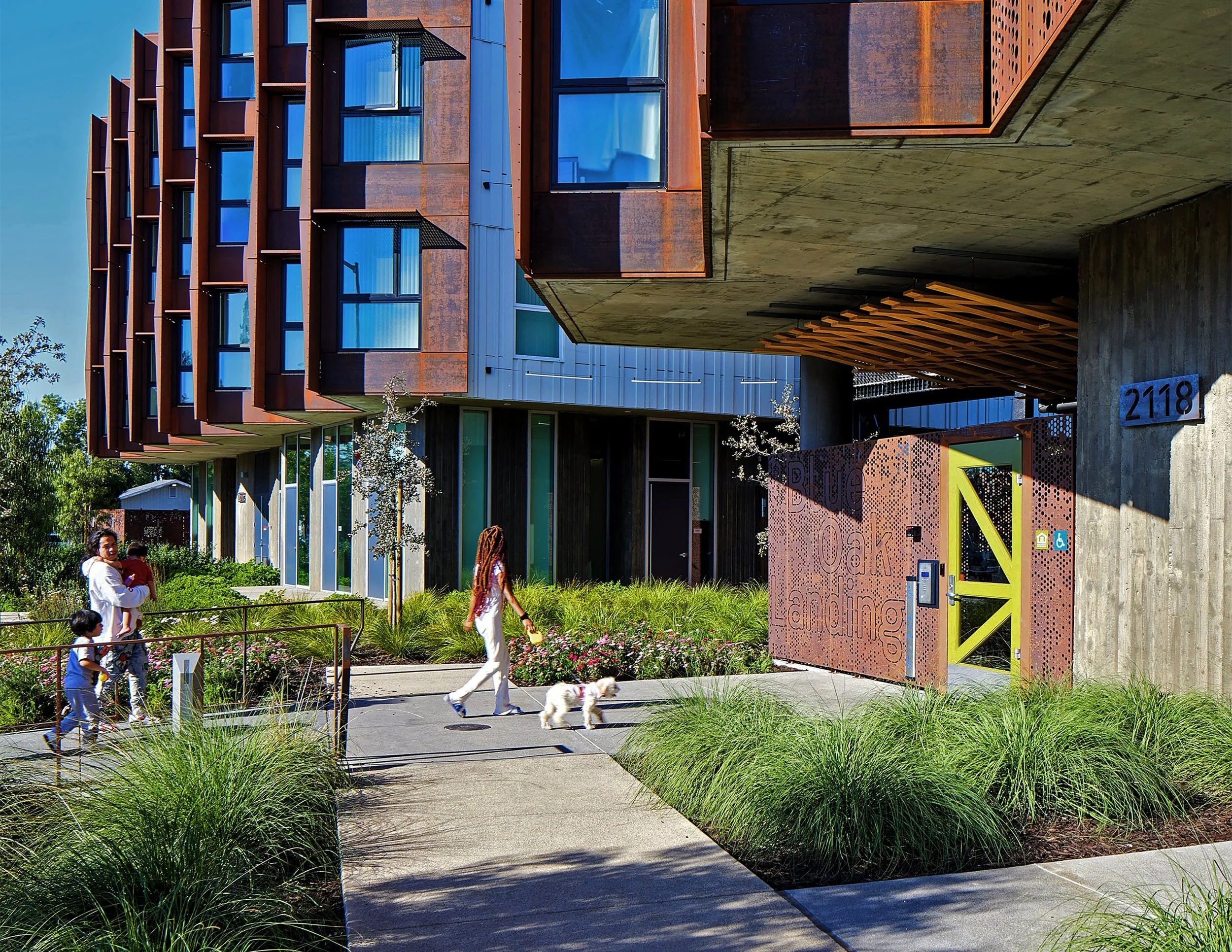 Located just north of downtown Vallejo, Blue Oak Landing provides 75 fully affordable and supportive apartments in two four-story buildings linked by open-air circulation across a shared courtyard. The landscape includes street improvements and a rear courtyard for community gardens, play area, public gathering areas, a dog run, and integrated green infrastructure.