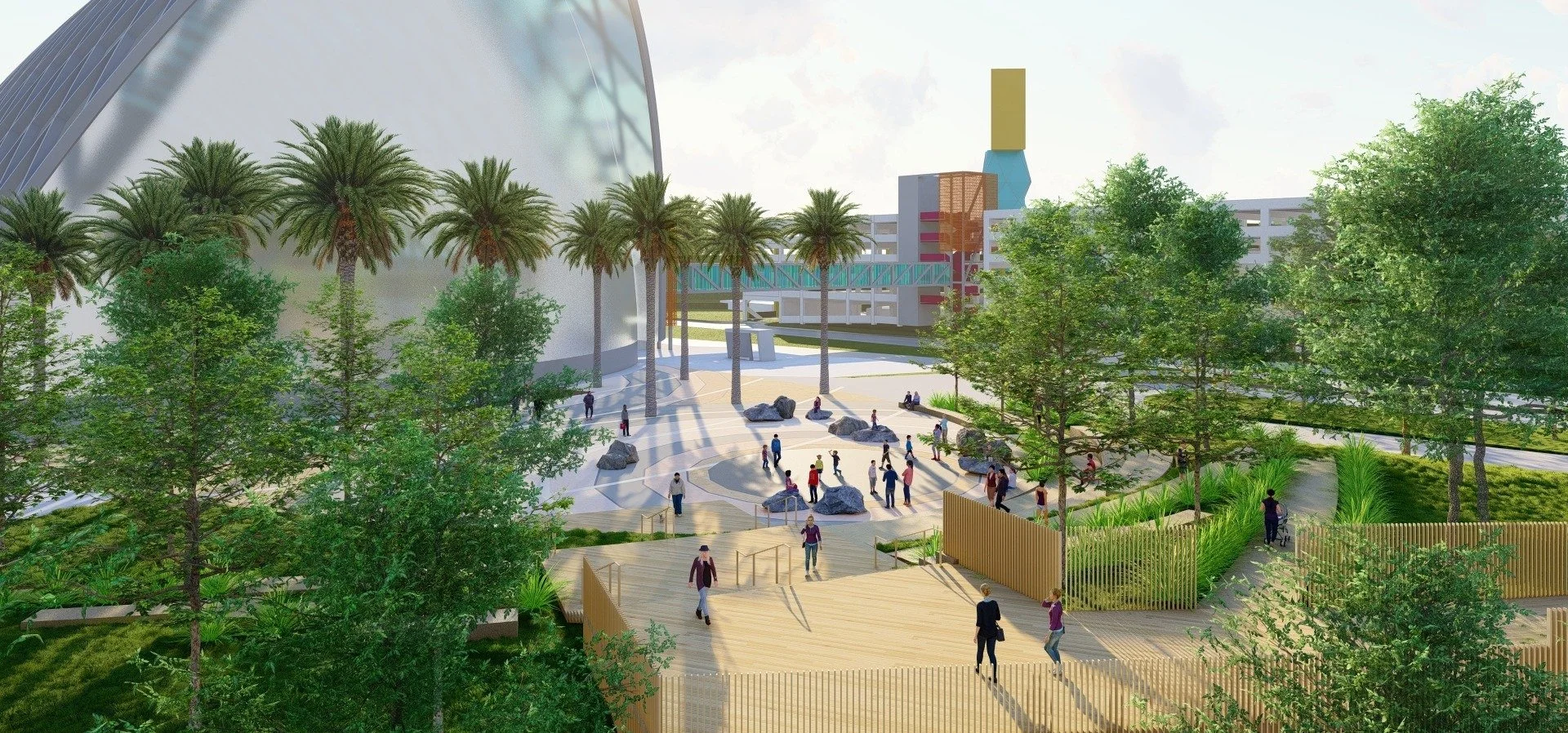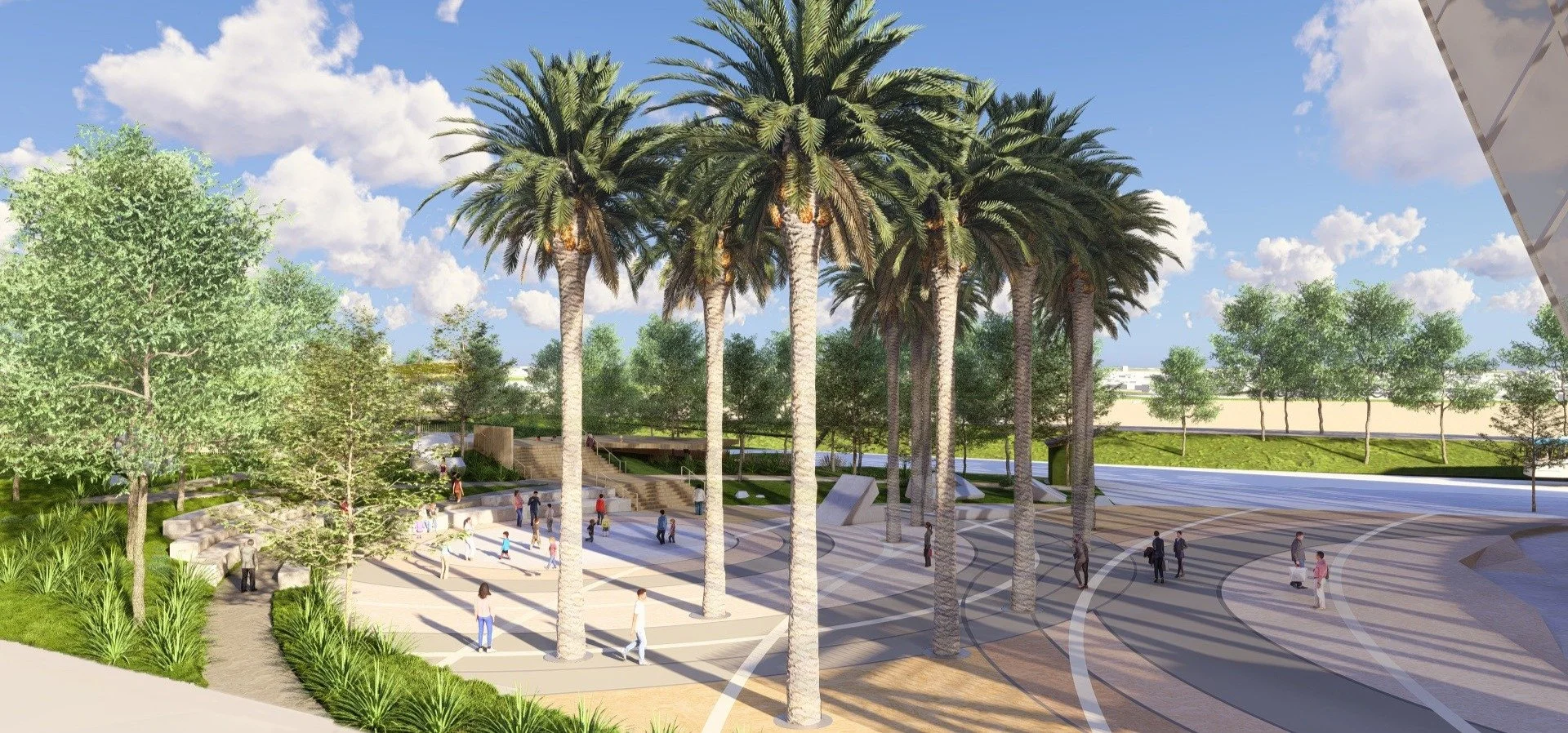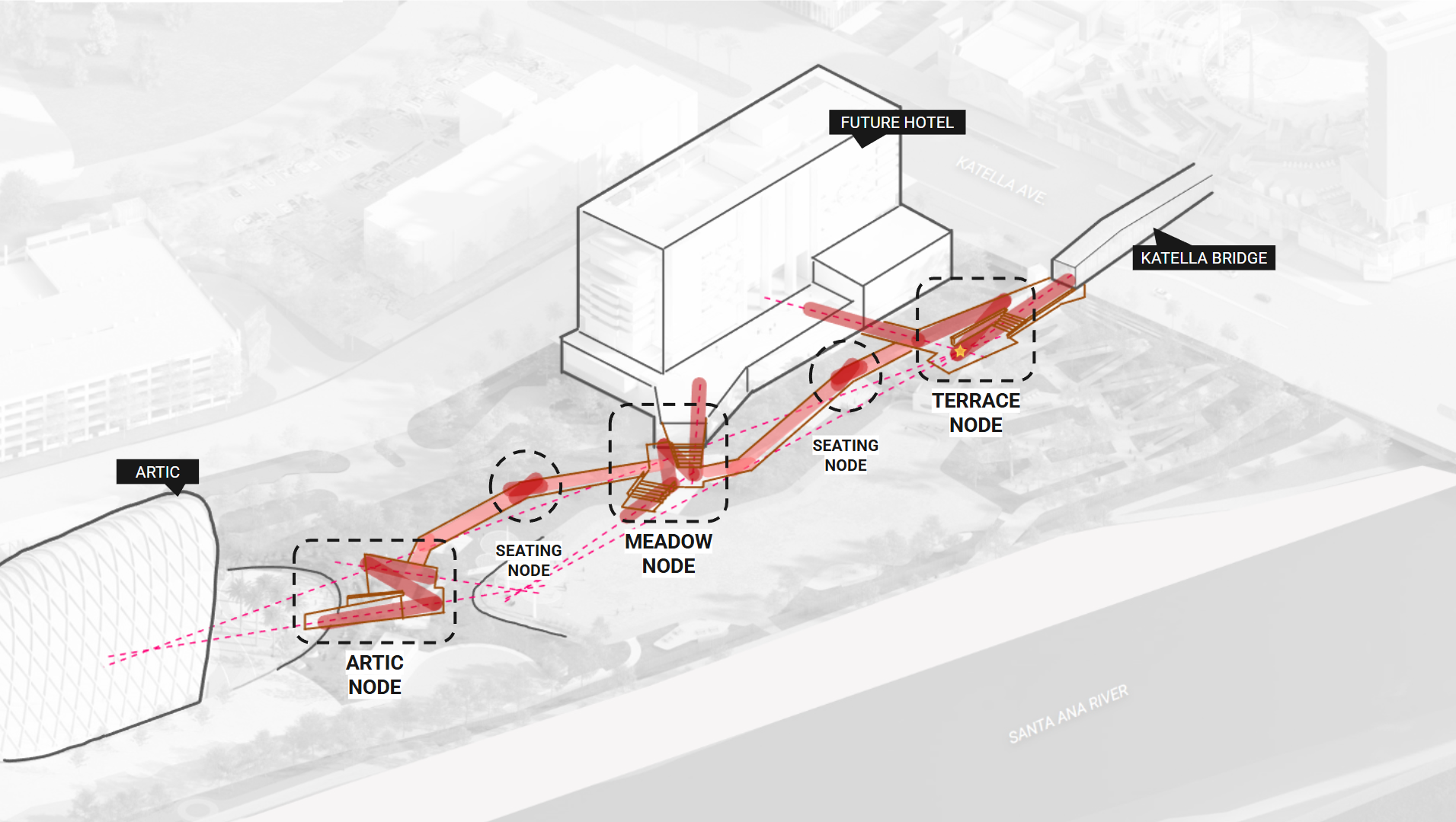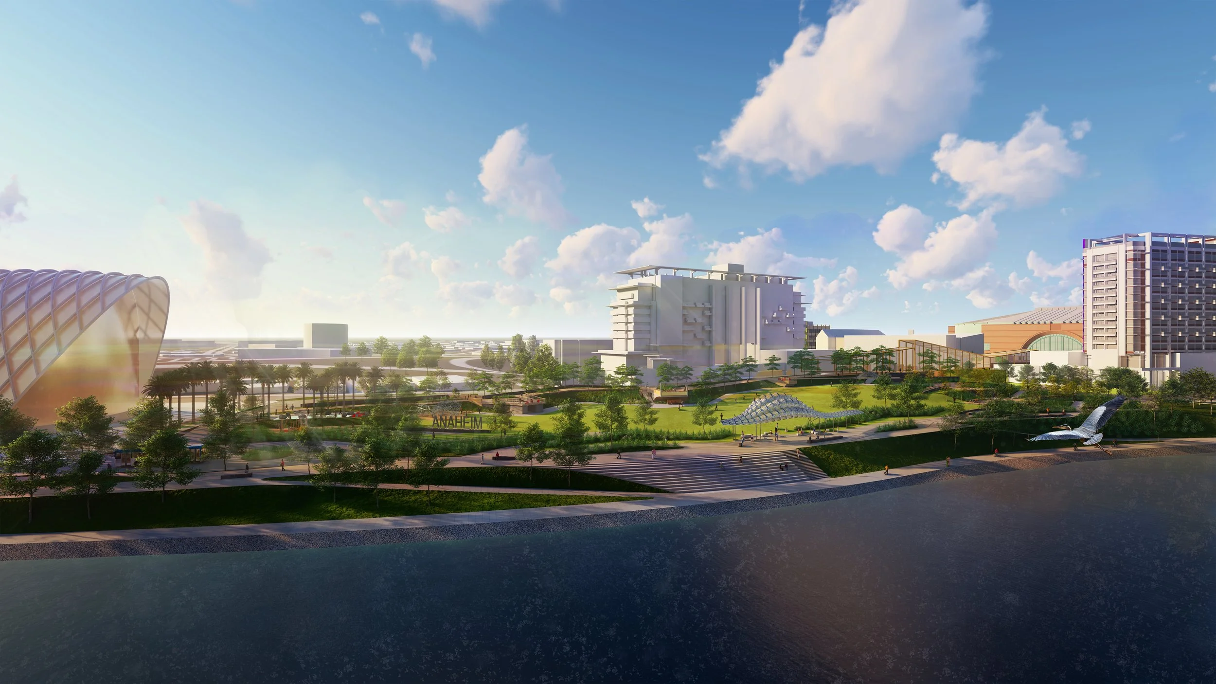 Positioned between the Anaheim Regional Transportation Intermodal Center and the Santa Ana River Trail, Meadow Park establishes a dynamic and welcoming gateway for visitors arriving by rail, bus, and bicycle. An elevated pedestrian promenade seamlessly connects the arrival plaza to the city’s premier entertainment district, offering overlooks and integrated seating that enrich the journey with moments of pause.