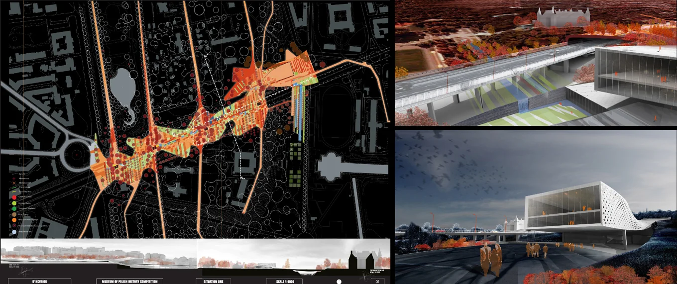 The new Museum of Polish History will be situated within a richly saturated historical urban landscape. Layers of history accumulated to this day are inscribed into the immediate surroundings of the new building. These surroundings include the Botanical Gardens, agricultural and the palace gardens. The new landscape is responsive to these landscapes, and creates continuity across it’s surface to weaved the larger park together. Our project proposes an integrative weave and negotiates spatially and culturally between the territories historic fragments. The larger urban strategy proposes to articulate an elastic landscape on top of the motorway trench of Trasa Lazienkowska. The elastic landscape reaches out and negotiates spatially between various historical and modern axial systems and is seen as a programmatic extension of the Museum of Polish History. It is comprised of elements that allow for a reflective contemplation, interpretation, participatory documentation, and the active re-writing of history. The elastic landscape becomes, with elements like a oral history collector or a scriptive history repository, a dynamic receptacle of history physically present within the landscape, at same time a digitally active repository, utilizing locative media and social-networking technologies. The landscape is sporadically recessed to allow light and visual contact for the traffic below. At the same time, it acknowledges the most recent layer of infrastructural Polish history, by giving it its own presence rather then negating it. The landscape also serves as a living-infrastructure, to channel stormwater from both it’s surface and the motorway surface to a treatment wetland at the lower museum level. This wetland becomes an aerating waterfall for the museum below, cloaking the noise of the traffic, cleansing water and creating a new performative ecology for migratory birds.